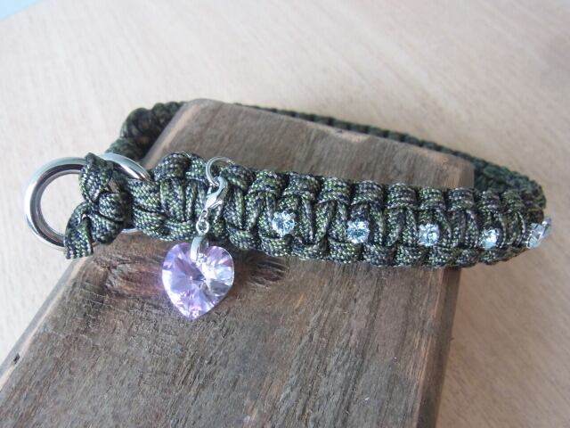 パラコードで編んだハーフチョークタイプの首輪にラインストーンを編み込み、更にスワロスキーのハートチャームを付けました。
