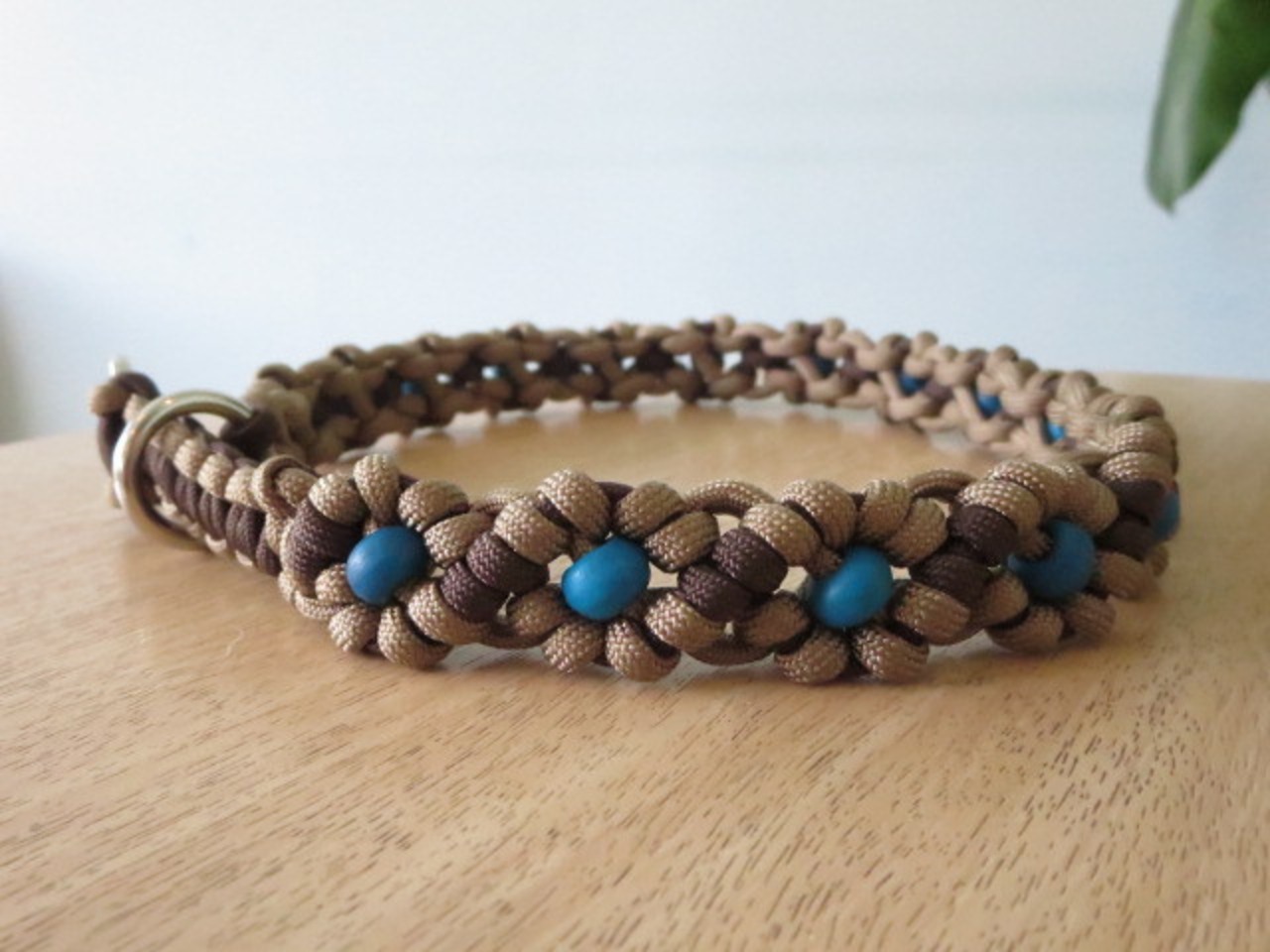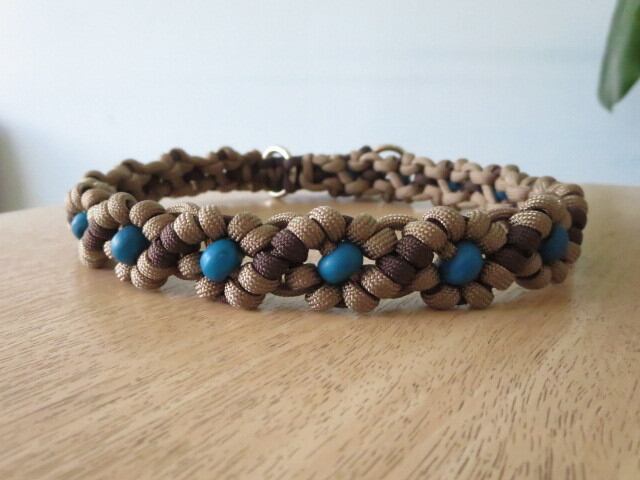 ゴールドブラウン色×ダーク色の首輪に綺麗なブルーのボーンビーズを通した落ち着いた雰囲気の首輪です(*^-^*)