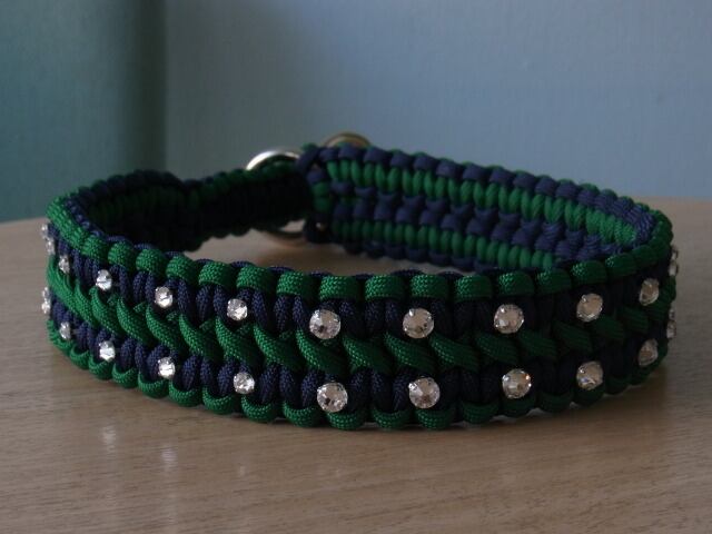丈夫なパラコードで編んだハーフチョークタイプの首輪にラインストーンを編み込みました。