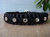パラコードで編んだハーフチョークタイプの首輪にラインストーンを編み込み、更にスワロスキーのハートチャームを付けました。