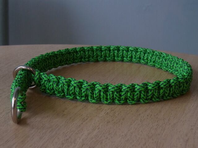パラシュートコードで編んだチョークタイプのカラフルで丈夫な首輪です。